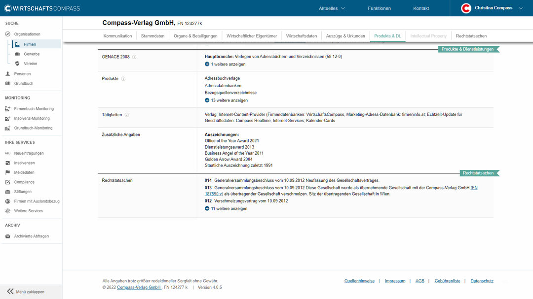 "Produkte & Dienstleistungen" zeigen Informationen zur Tätigkeit der Firma, den angebotenen Produkten oder auch eine Klassifizierung anhand des OENACE-Codes. Im Bereich "Intellectual Property" findet man außerdem alle beim österreichischen Patentamt angemeldeten/gelöschten Marken, Patente und Gebrauchsmuster. Der letzte Bereich zeigt die erfassten "Rechtstatsachen".