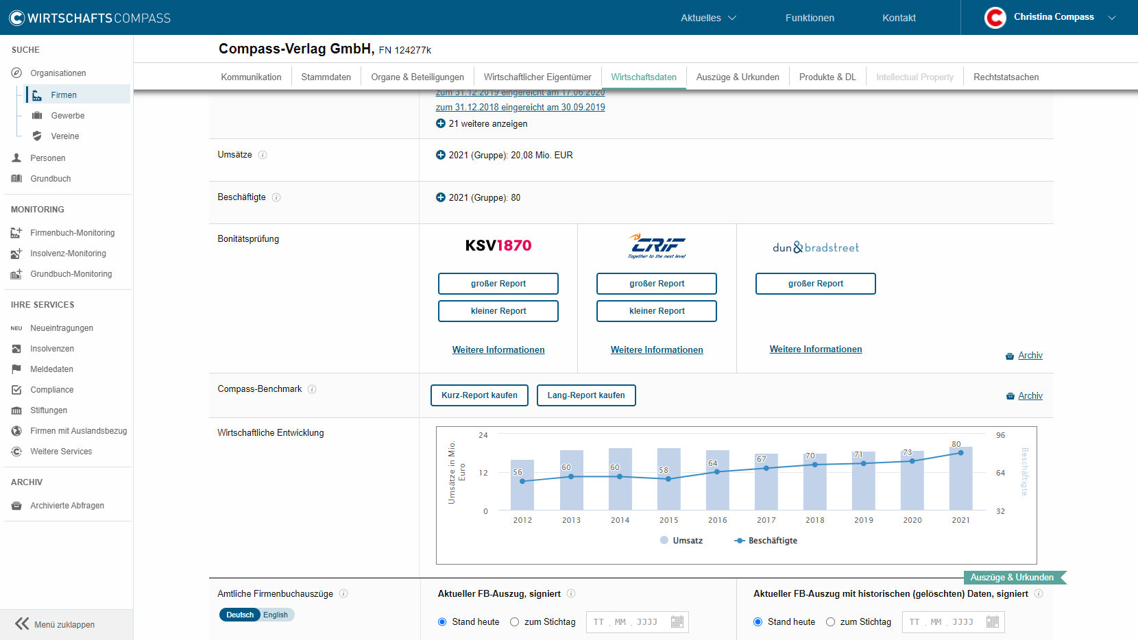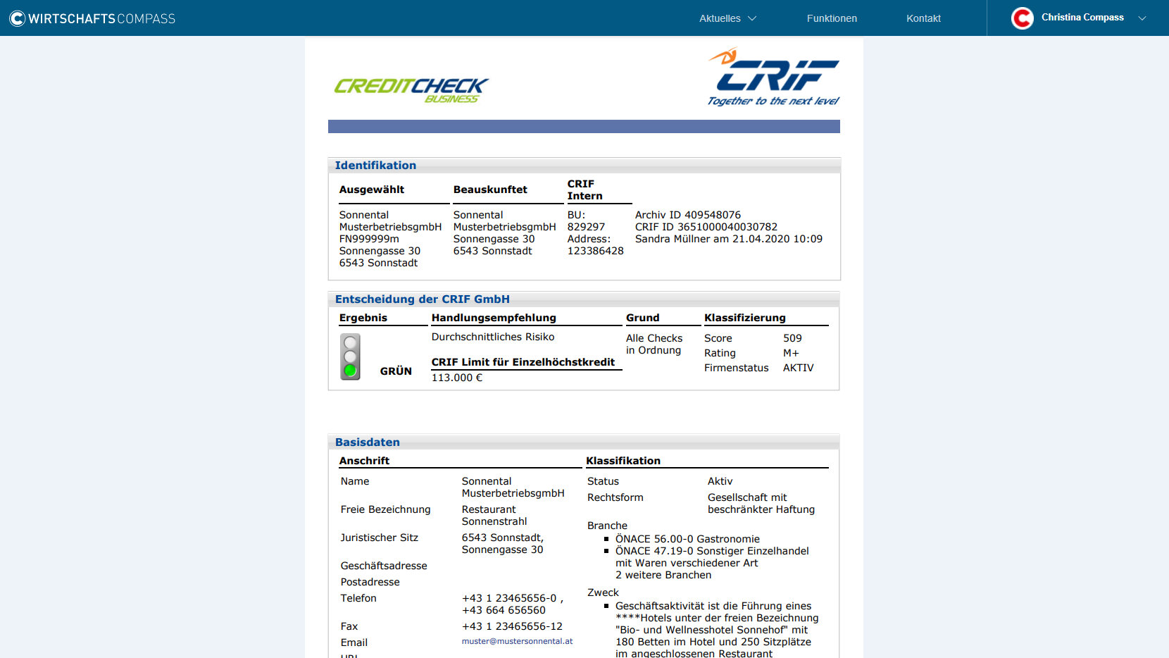 Mit unseren Kooperationspartnern KSV1870, CRIF, sowie Bisnode Dun & Bradstreet Business Report stehen Ihnen hochwertige Bonitätsprodukte direkt im Wirtschafts-Compass zur Verfügung. Damit können Sie die finanzielle Situation und das Zahlungsverhalten eines Unternehmens bestmöglich beleuchten, den Compliance-Verpflichtungen nachkommen, sowie eine fundierte Risikoabschätzung treffen.