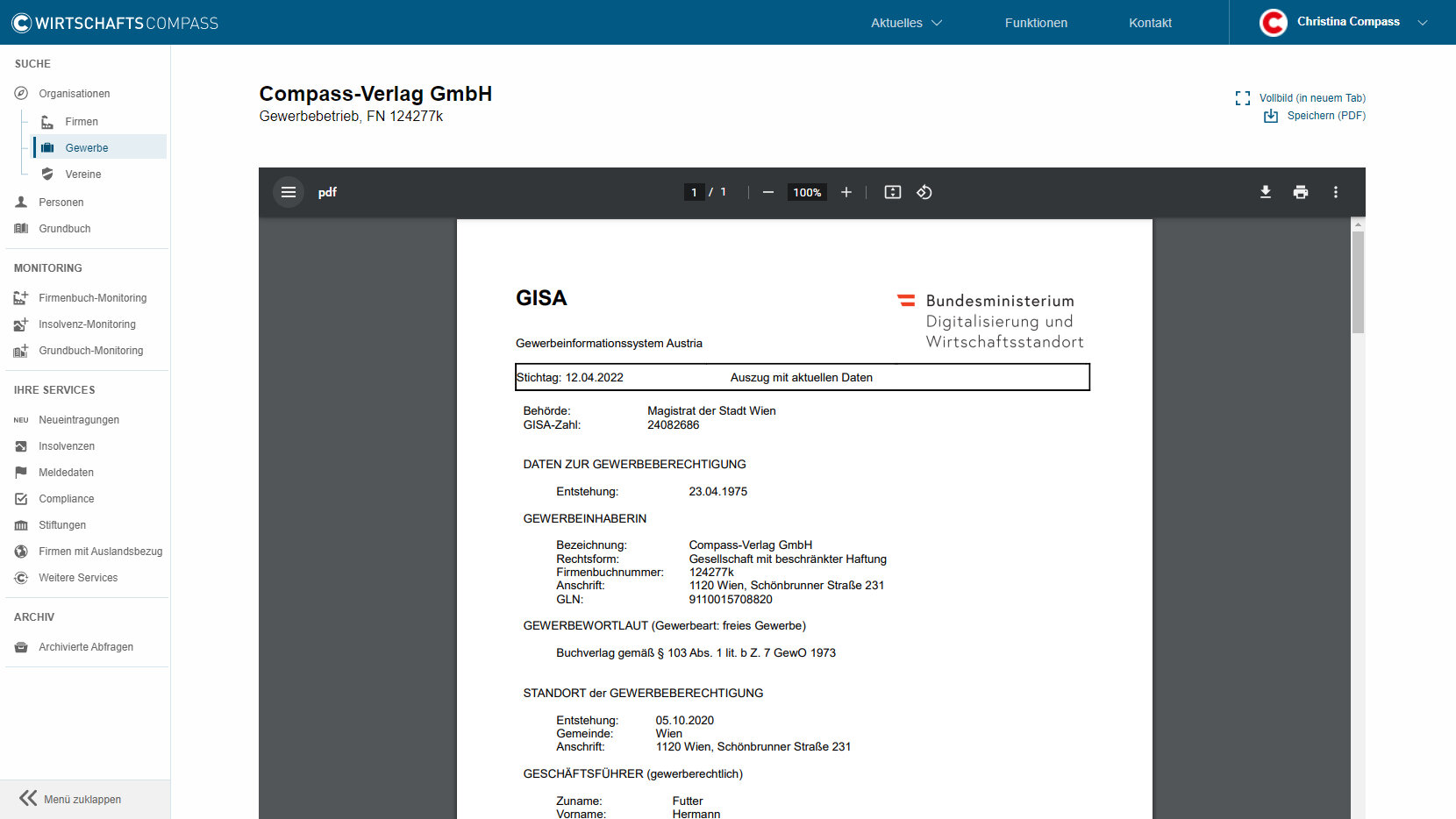 Pro Standort werden alle aktiven, ruhenden und gelöschten Gewerbeberechtigungen detailliert aufgeschlüsselt. Gezeigt wird der exakte Berechtigungswortlaut, die GISA-Zahl, das Eintragungsdatum, aktive und ehemalige gewerberechtliche Geschäftsführer bzw. Gewerbeinhaber, sowieso weitere Informationen zur Kammerzugehörigkeit. Außerdem die Fachgruppe der Berechtigung, die OENACE Klassifizierung und das zuständige Bezirksamt. Darüber hinaus ist die kostenlose und direkte Abfrage von GISA-Auszügen möglich.