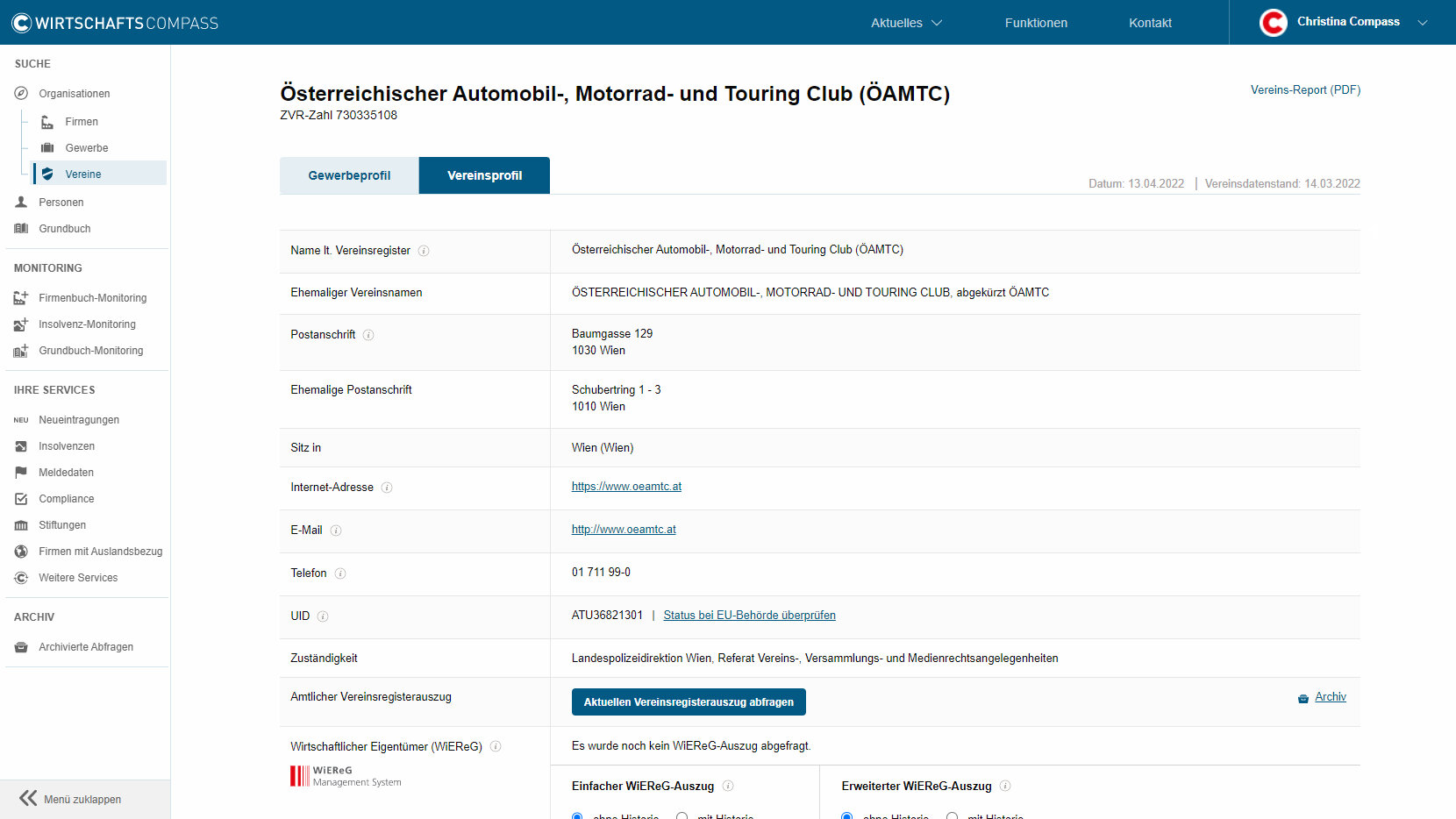 Zu einem Verein kann jederzeit ein aktueller Vereinsregisterauszug, samt Signatur, direkt aus dem Profil heraus abgerufen werden. Auch ist die Abfrage von WiEReG-Auszügen möglich und die Nutzung des damit verbunden WIEREG-Monitorings. Dadurch haben Sie direkt im Profil den aktuellen Status des Wirtschaftlichen Eigentümer Registers ausgewiesen.